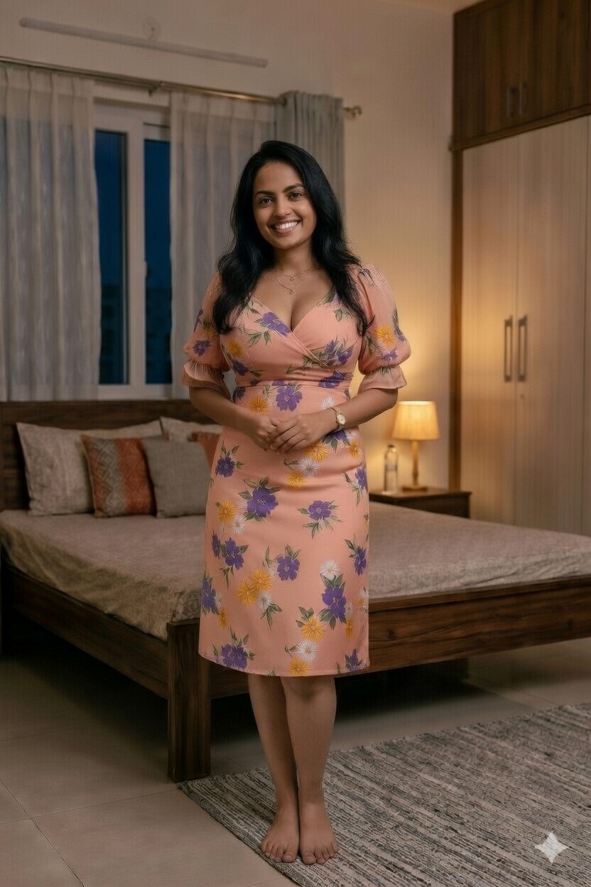 ഒരു പീച്ച് കളർ ഫ്ലോറൽ ഡിസൈനിലുള്ള ഫ്രോക് ടോപ്,കാലിനു മുട്ടിനു മേലെ ഇറക്കം,സ്വീറ്റ് ഹാർട്ട് ടൈപ്പിലുള്ള കഴുത്തു അതിൽ മുലച്ചാൽ പൊങ്ങി നിൽക്കുന്നത് കാണാം